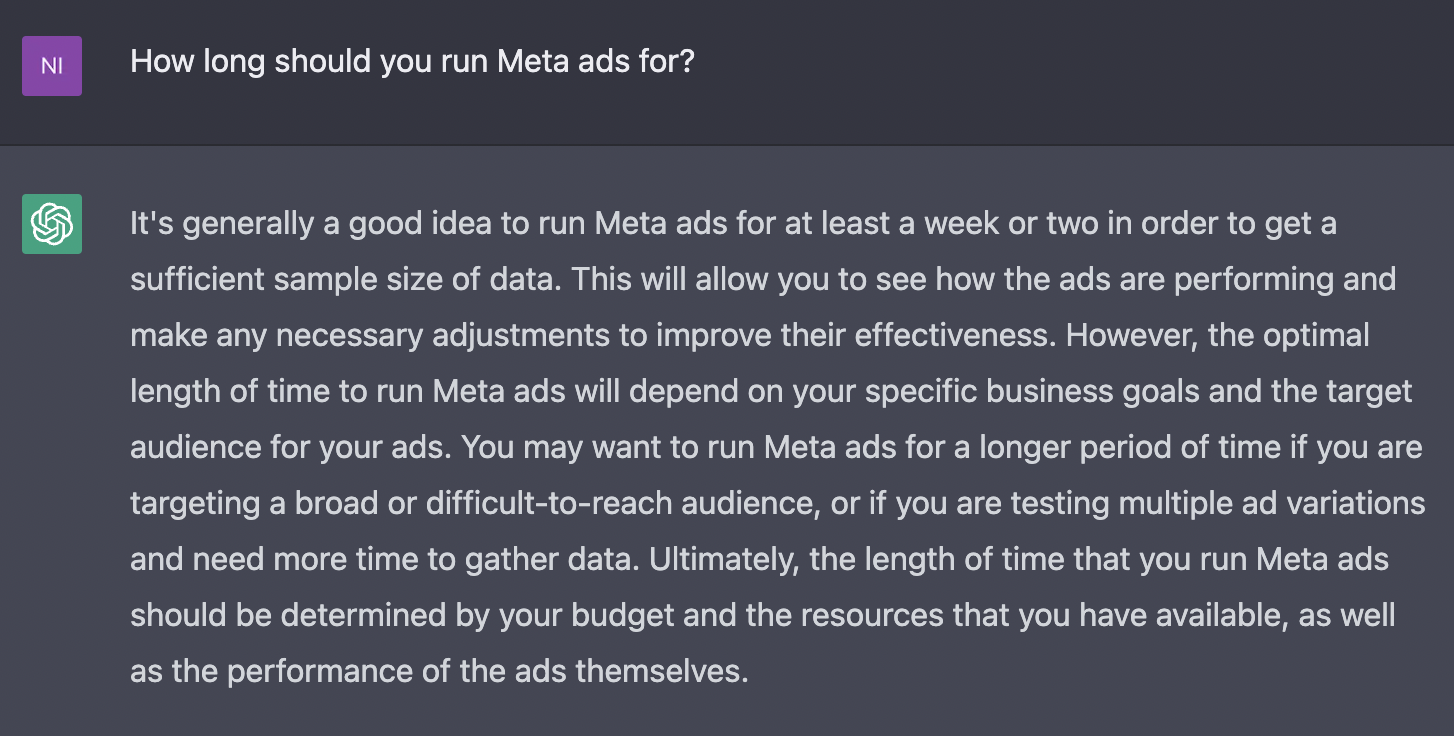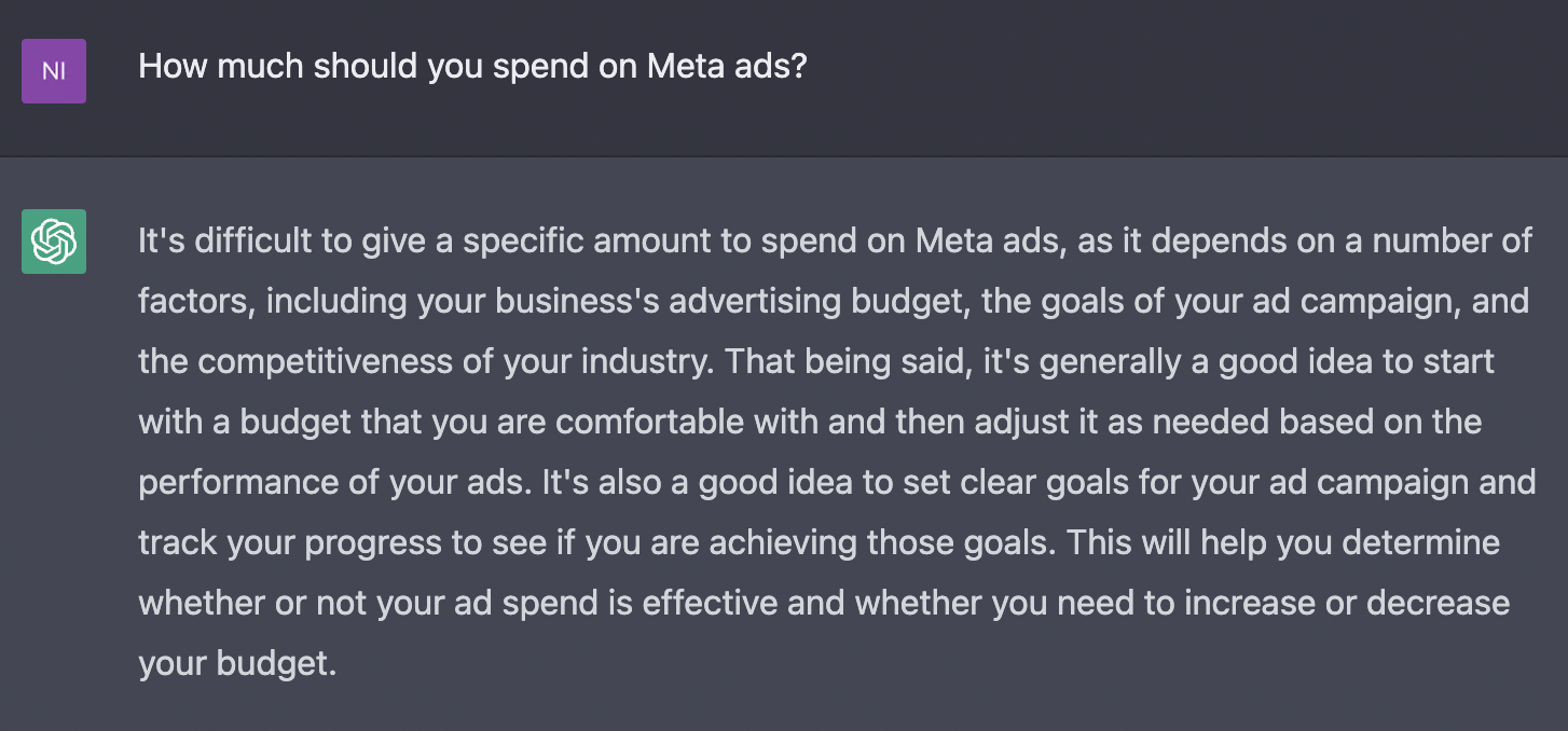 I thought I would experiment with this by giving the chat bot the two most asked questions I get from new clients: How much should I spend on Meta ads and how long should I run Meta ads for.